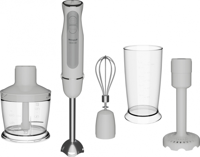 Погружной блендер от Weissgauff - это многофункциональный кухонный прибор 4 в 1, сочетает в себе функции блендера, измельчителя, миксера и насадки для приготовления пюре, который станет незаменимым помощником на вашей кухне и поможет вам воплотить в реальность самые смелые кулинарные идеи!