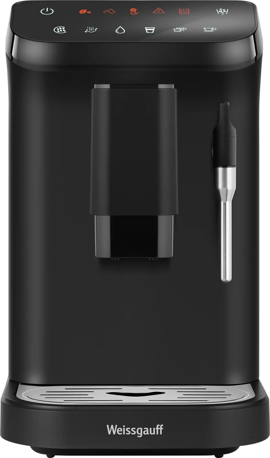 Компактная кофемашина от Weissgauff, выполненная в черном цвете, оснащенная контейнером для зерен на 200 грамм, обладающая сенсорной панелью управления, системой подачи молока с автоматическим капучинатором, внешней емкостью для молока, а также 5 заранее предустановленными программами для приготовления ароматного вкуснейшего кофе прямо на вашей кухне!