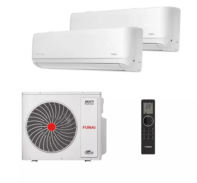 Современная инверторная мульти сплит-система Funai для двух комнат по 25 м² каждая. Обеспечивает мощный обдув при минимальных энергозатратах (всего 20 Вт), тихую работу до 22 дБА и работу на охлаждение до -15°C / обогрев до -22°C с хладагентом R32.