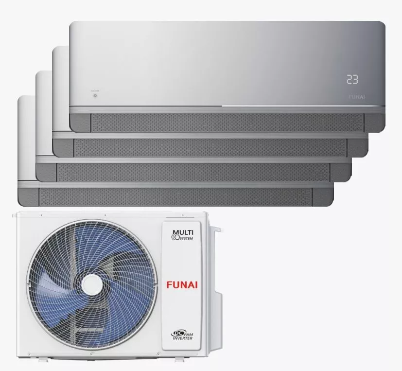Инверторная мульти сплит-система Funai серии KAGAMI для четырех комнат по 20 м² (общая площадь 70-80 м²). Обеспечивает деликатный обдув (SMART Soft Breeze с перфорированными жалюзи и SMART Air в 4 направлениях), класс энергоэффективности A++ и встроенный Wi-Fi модуль.