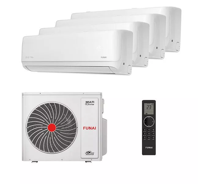 Инверторная мульти сплит-система Funai серии DAIJIN (KIRIGAMI, RAM-I-DA25HP.W01/S x4 + RAM-I-4KG105HP.01/U) для четырех комнат по 25 м² (общая площадь 90-100 м²). Обеспечивает сверхтихую работу от 22 дБ(А), 7 скоростей вентилятора с энергозатратами 20 Вт, встроенный Wi-Fi и работу на холоде до -15°C / обогреве до -22°C.
