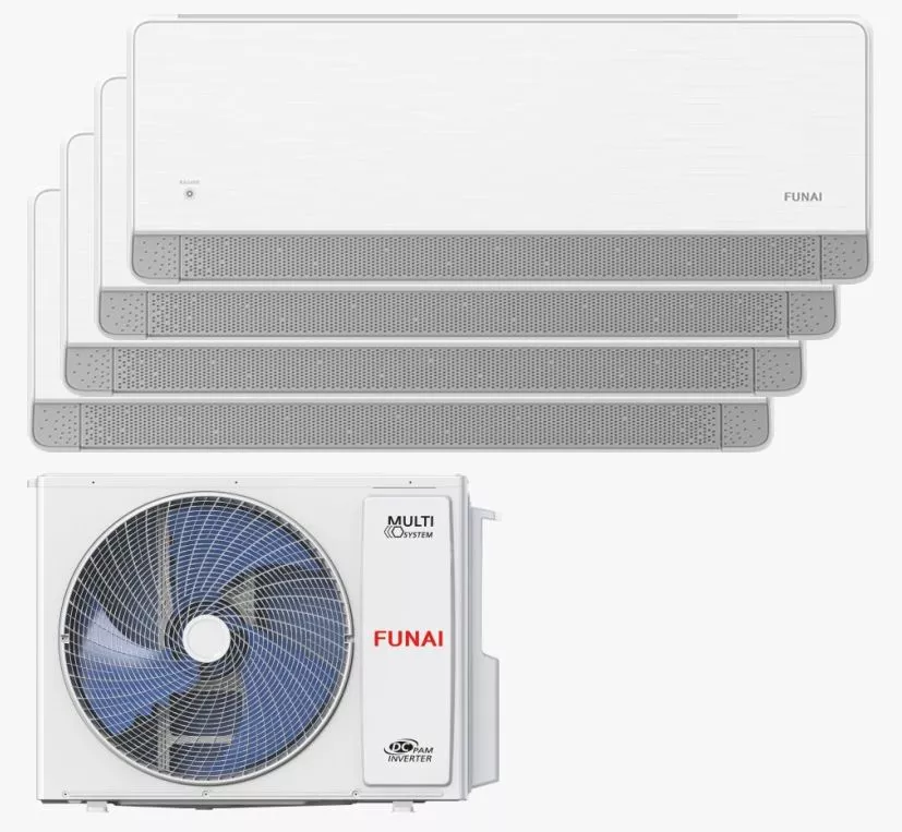 Инверторная мульти сплит-система Funai серии KAGAMI White для четырех комнат по 25 м² (общая площадь 90-100 м²). Обеспечивает деликатный обдув (SMART Soft Breeze с перфорированными жалюзи и SMART Air в 4 направлениях), класс энергоэффективности A++ и встроенный Wi-Fi модуль.
