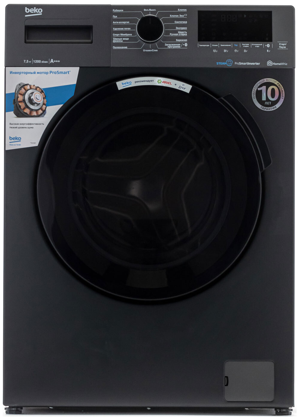 Стильная стиральная машина цвета антрацит оснащена инверторным мотором ProSmart, нагревательным элементом Hi-Tech с защитой от накипи, технологией обработки одежды паром SteamCure, электронным контролем дисбаланса в барабане и контролем пенообразования. 15 программ стиральной машины включают специализированные режимы для разных типов тканей, быструю стирку за 14 минут, гипоаллергенную стирку и эффективное удаление пятен. При глубине корпуса 45 см максимальная загрузка барабана стиральной машины составляет 7,5 кг. Беспроводное управление HomeWhiz позволяет следить за стиркой и управлять работой стиральной машины с вашего смартфона или планшета.