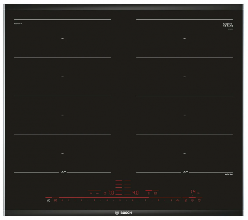 Индукционная варочная панель Bosch PXX675DC1E шириной 60 сантиметров 8 серии с рамкой Comfort. Четыре индукционные конфорки под высококачественной стеклокерамикой SCHOTT CERAN. Интерфейс DirectSelect Premium длиной 30 см: выбор желаемой функции и уровня нагрева одним касанием пальца.