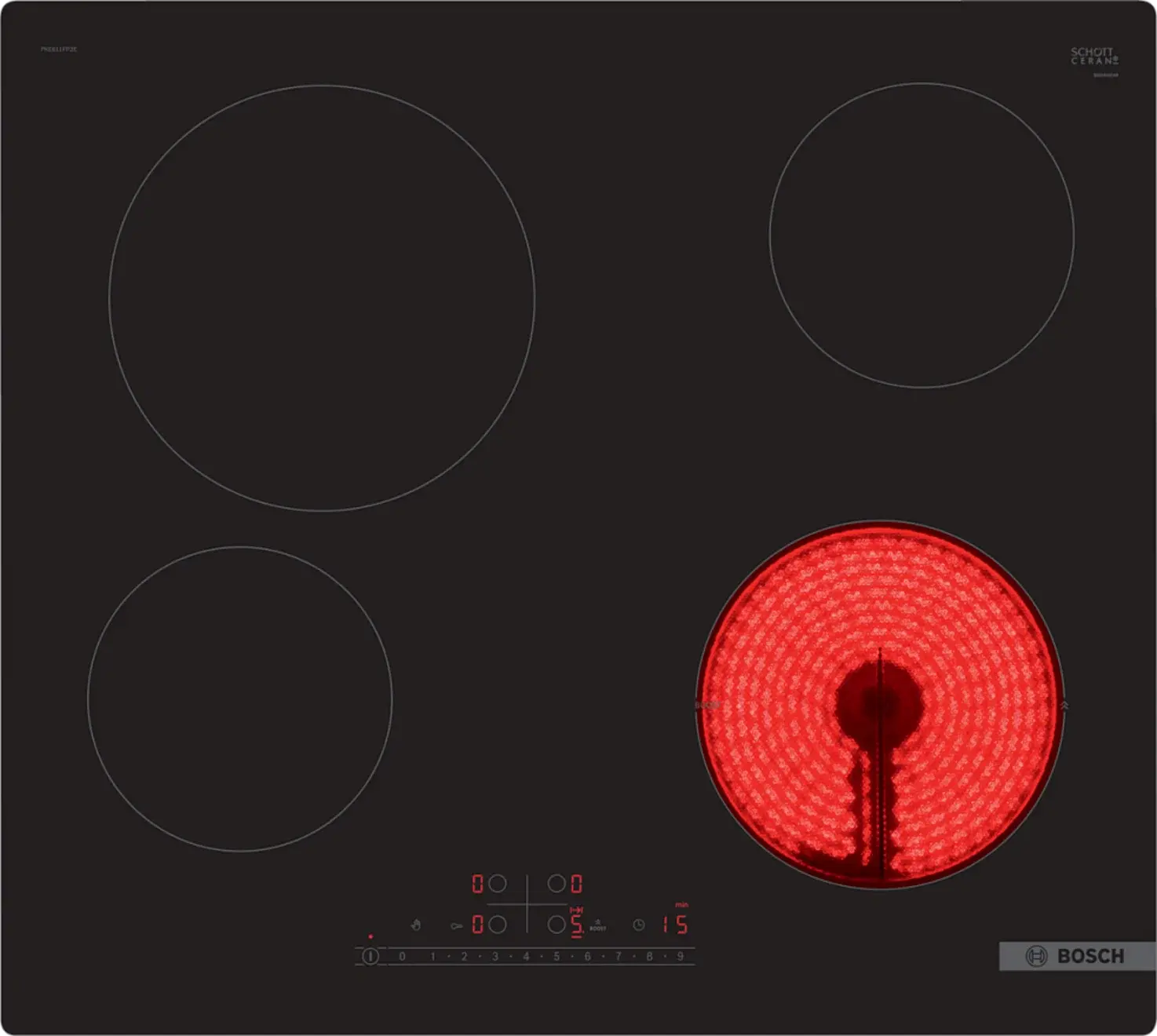 - Электрическая варочная панель Bosch PKE611FP2E с четырьмя конфорками идеально подходит для тех, кто ищет стильное и функциональное решение для своей кухни. Она выполнена в черном цвете и оснащена стеклокерамической поверхностью, что делает её не только элегантной, но и легко очищаемой. Панель имеет компактные размеры: ширина 59.2 см, глубина 52.2 см и высота всего 4.5 см, что позволяет легко интегрировать её в кухонную мебель с минимальными требованиями к нише для встраивания (56-56.2 х 49-50 см).