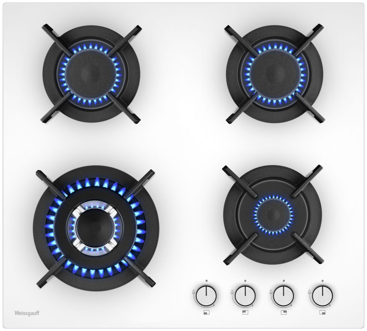 Встраиваемая независимая газовая панель Weissgauff шириной 60 см, исполненная в закалённом белом стекле - это стильное и компактное решение для вашей кухни!